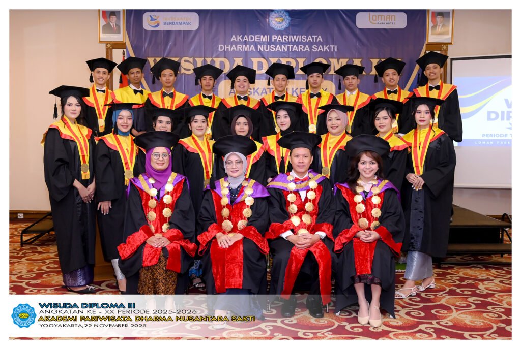 AKPARDA — Akademi Pariwisata Dharma Nusantara Sakti (AKPARDA) menyelenggarakan Wisuda Angkatan Ke – XX Tahun Akademik 2025–2026 pada Sabtu, 22 November 2025 di Loman Hotel Park Yogyakarta. Acara berlangsung sejak pagi dan diikuti oleh para wisudawan, orang tua, serta seluruh jajaran pimpinan dan dosen.