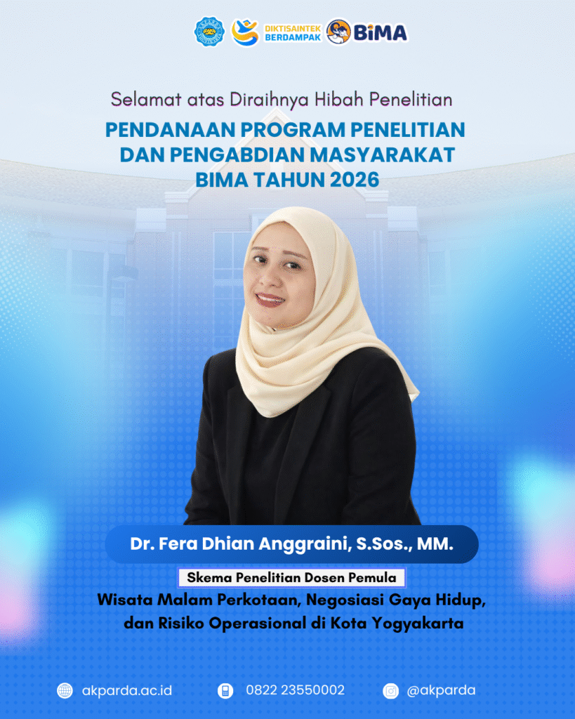 Pencapaian ini menjadi bukti nyata komitmen AKPARDA dalam mendorong pengembangan ilmu pengetahuan serta kontribusi aktif dosen dalam kegiatan penelitian yang berdampak bagi masyarakat. Adapun penelitian yang diusung oleh Dr. Fera Dhian Anggraini berjudul “Wisata Malam Perkotaan, Negosiasi Gaya Hidup, dan Risiko Operasional di Kota Yogyakarta.”